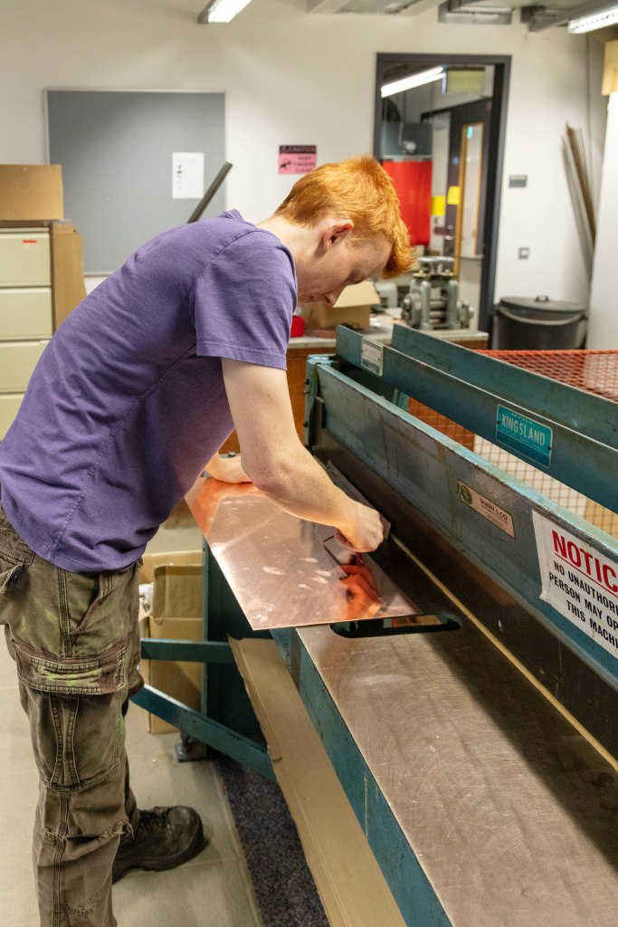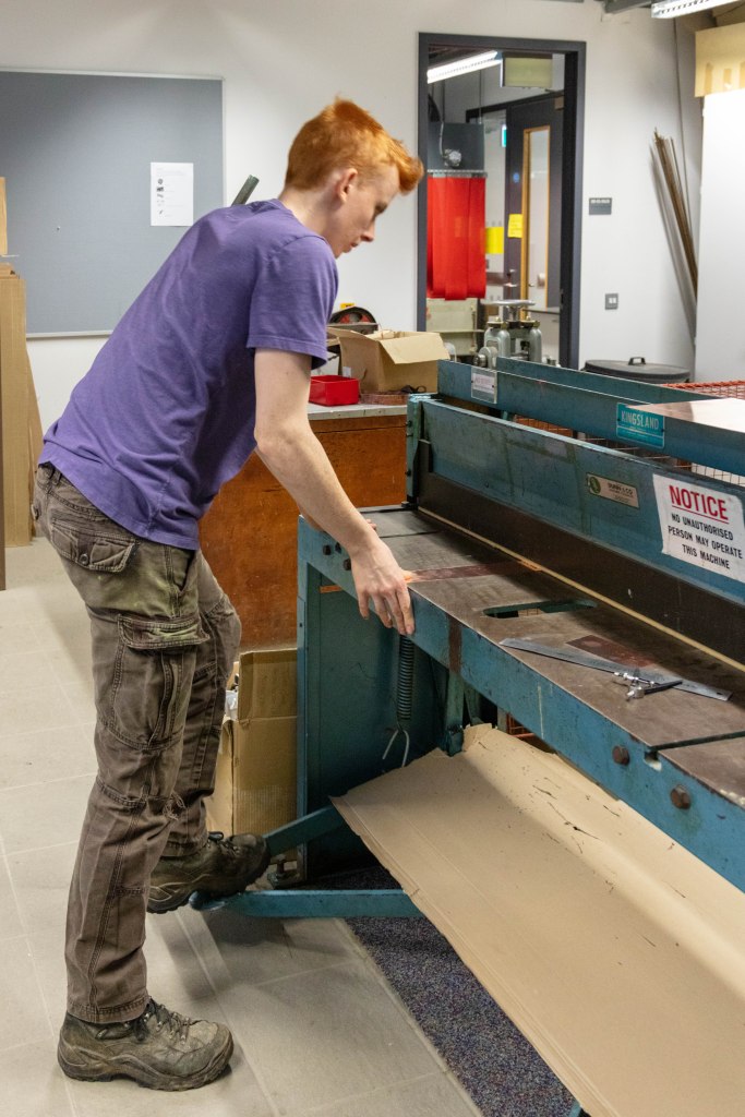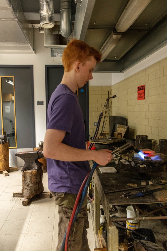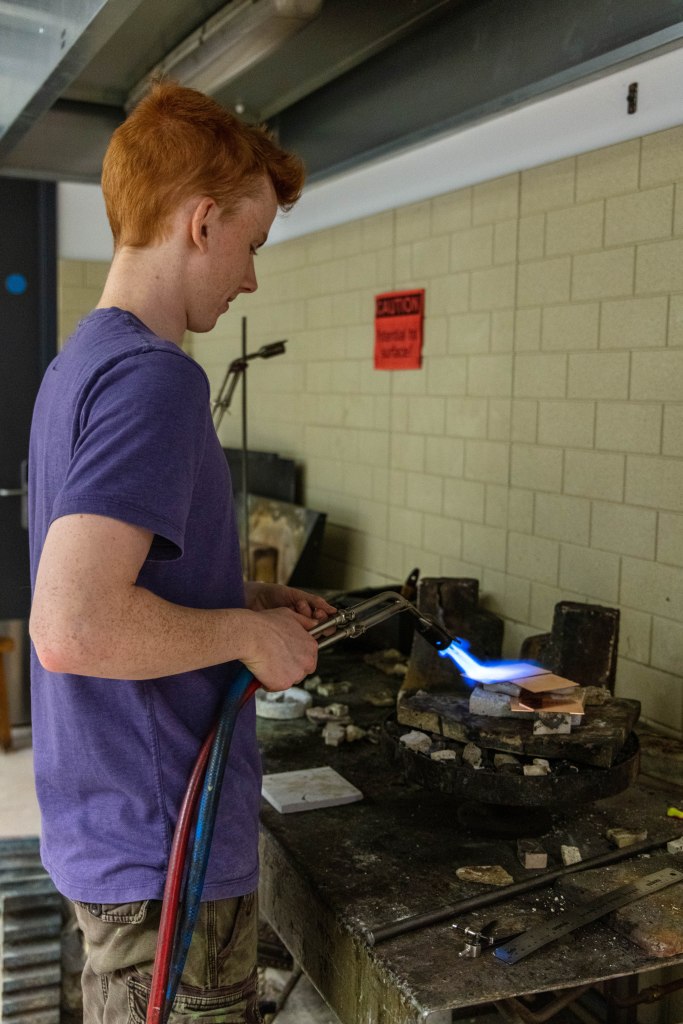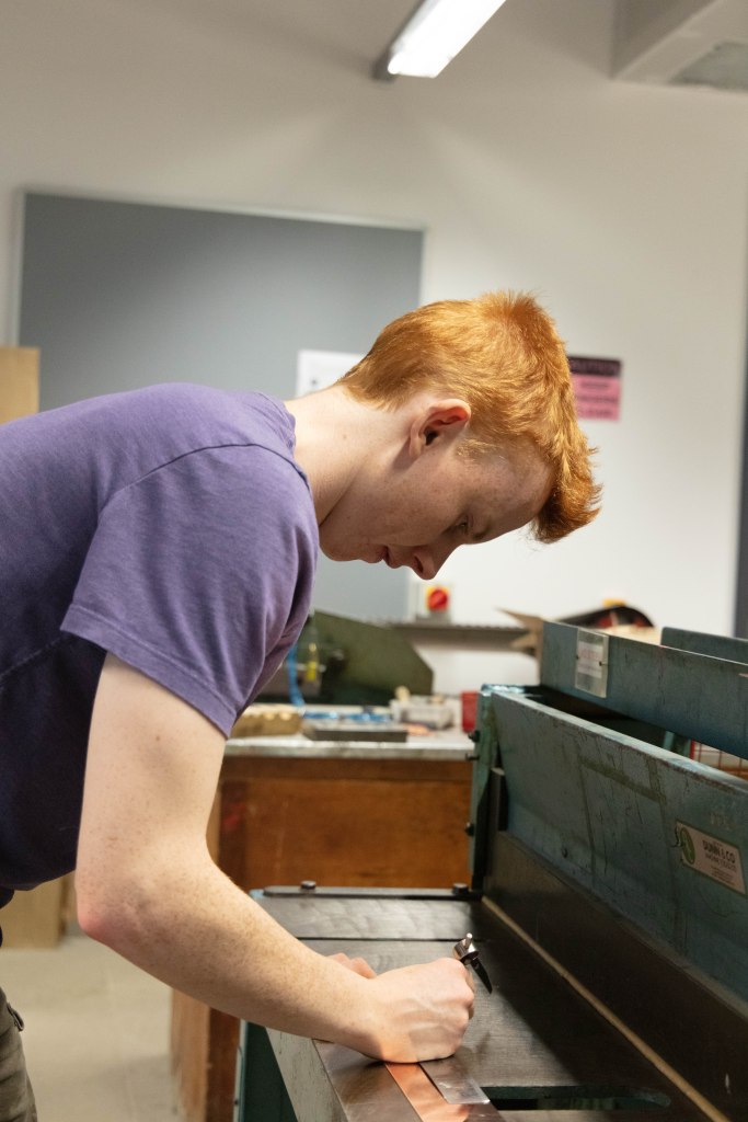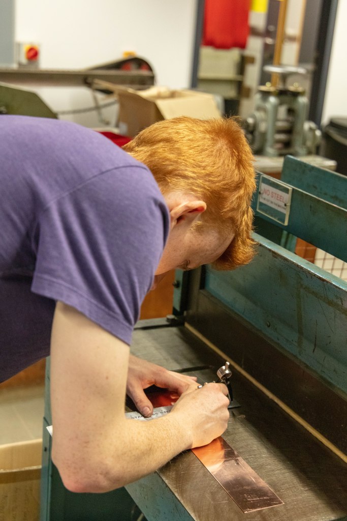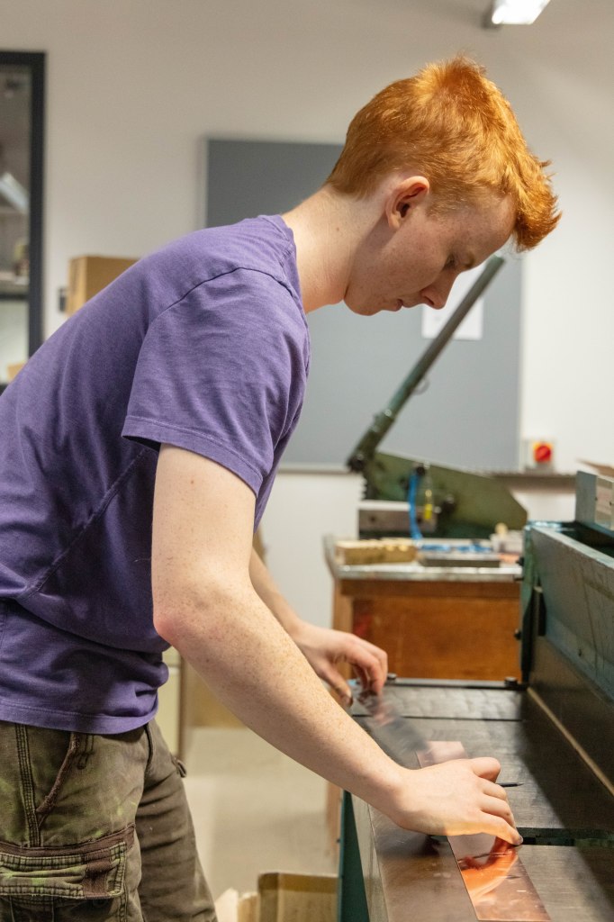 Taking photographs and thinking about everything that i read about improving the environmental portraits. While having that in the back of my mind i started to do my shoot. Unfortunately the work that Matthew was working on was mostly drawing as he had to plan out what he was going to do but also how to use copper without wasting the material- this included sketches, measurement, cutting out the shapes out of paper and see if he would be able to form it into the shape he had planned. I didn’t included this images down below as i didn’t like them – the composition was off, i couldn’t find the best angle that would work as his working desk is quite close to his class mates which made it little bit hard especially since they were there trying to work and asking them to move nicely wasn’t an option as i was got told i will not be moving or you can come back at a time where he would be alone in the room. I understand that i could face difficulties like these but i just didn’t expect it. I overcame it as I was able to convince Matthew to do something else for me to get the images and then he could get on with his work.