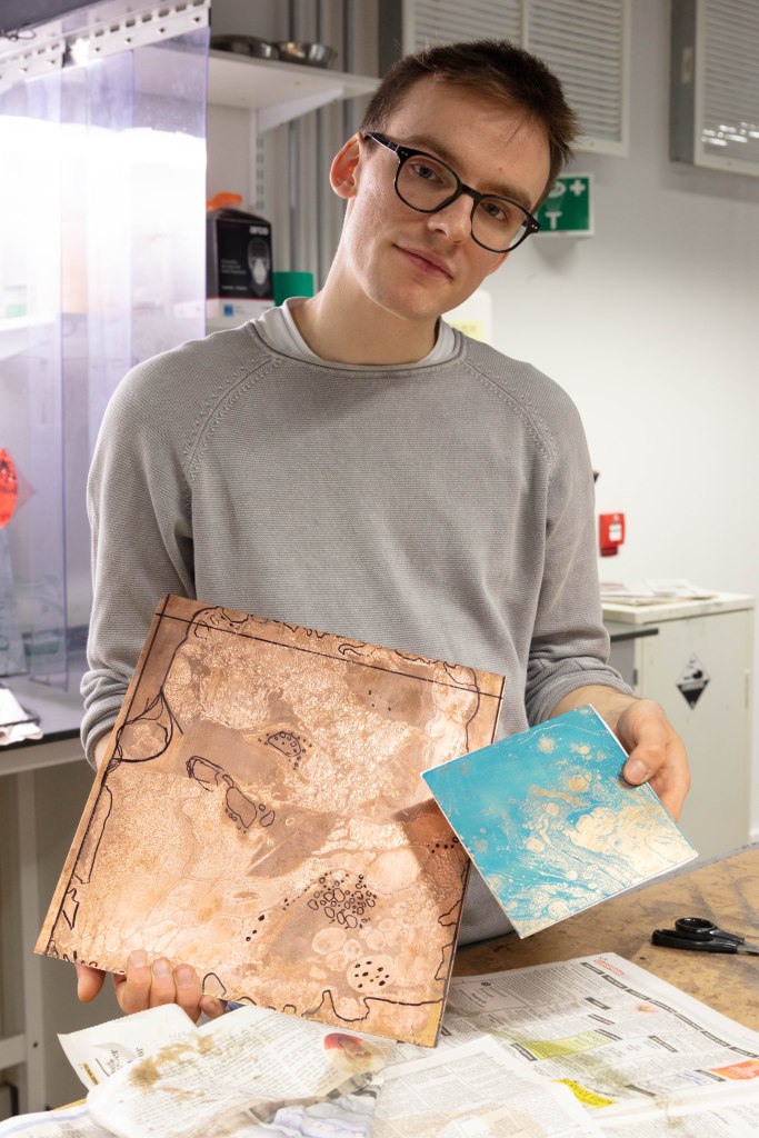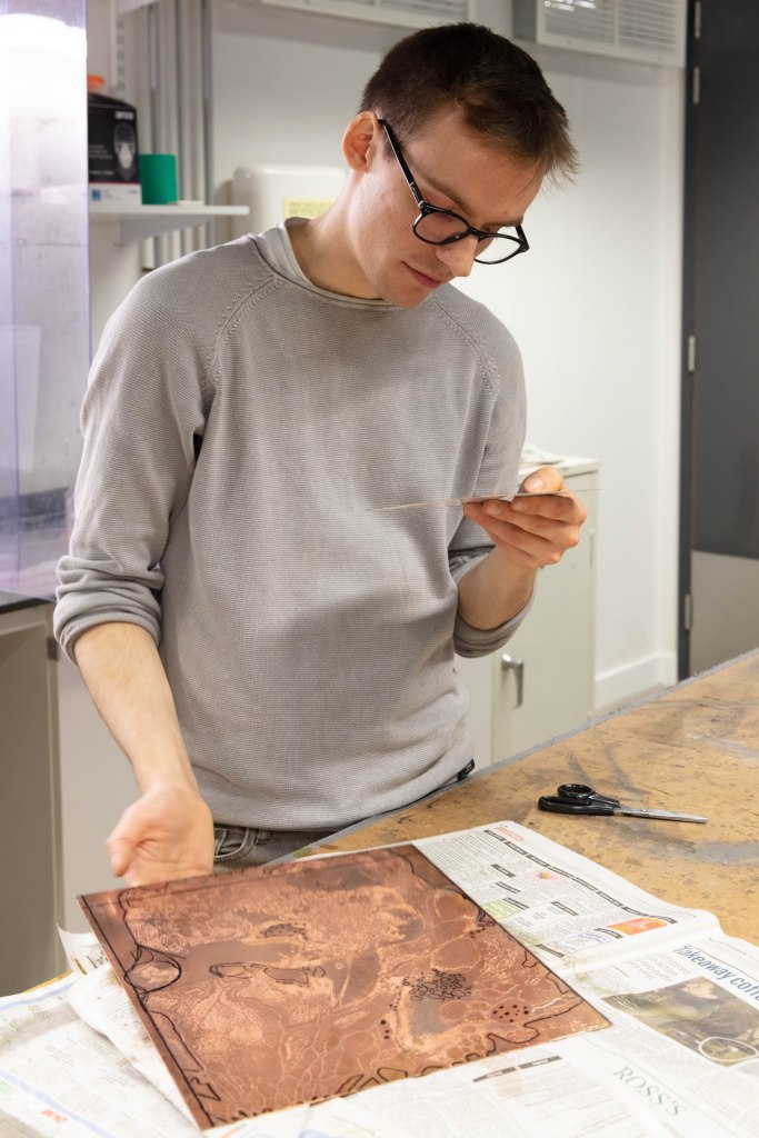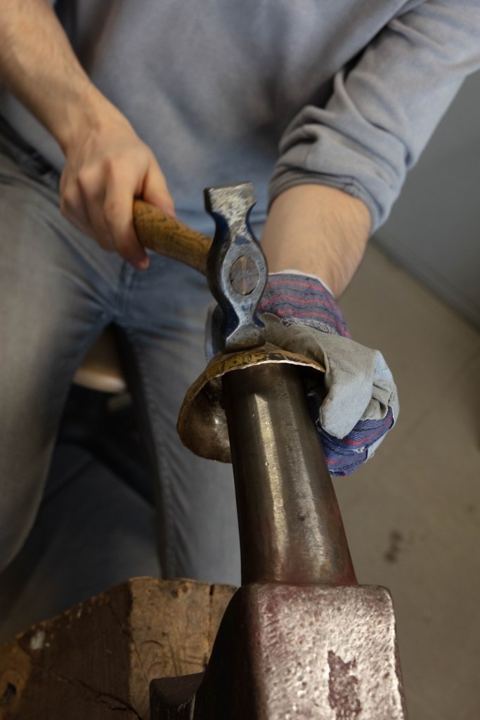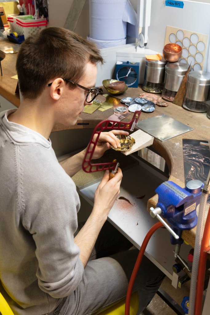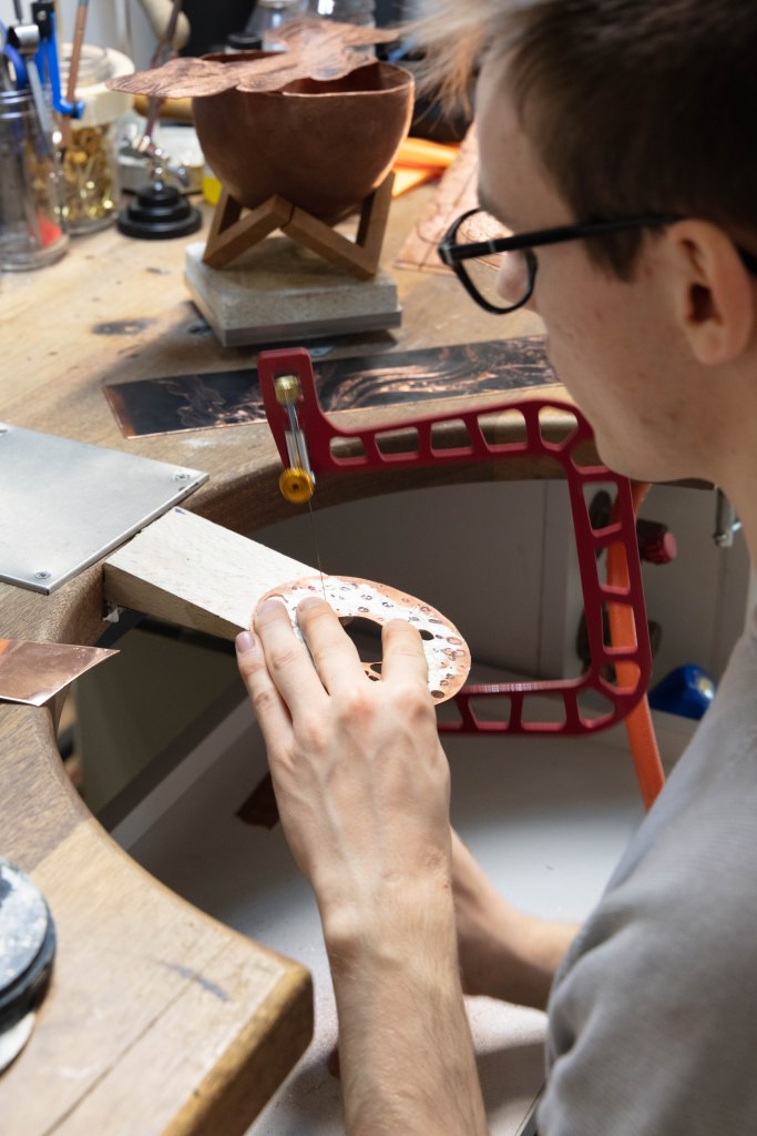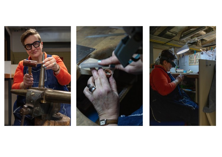 I think that this set of 3 works really well with each other and that one single image wouldn’t have this effect. I like how the set tells a story which is something i was going for. From the beginning to the end. I absolutely love the middle one the close up as i feel that it breaks it down and actually focuses on the detail which is very important in jewelery and silversmithing. As one small wrong movement made and everything goes bad. I also picked the one where she heats up the copper as a way to show more to her work, that she uses other tools and equipment which in some cases turn out really well.