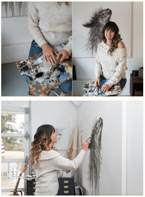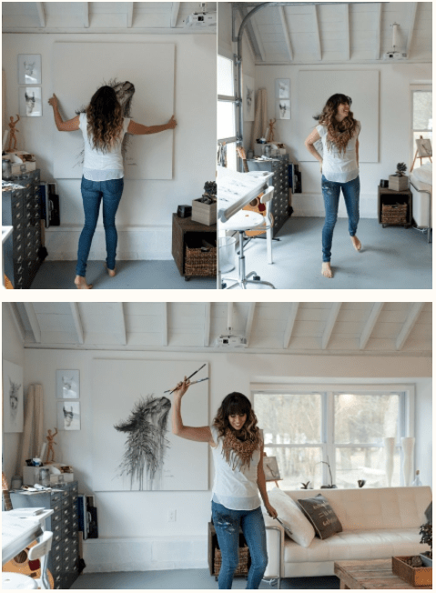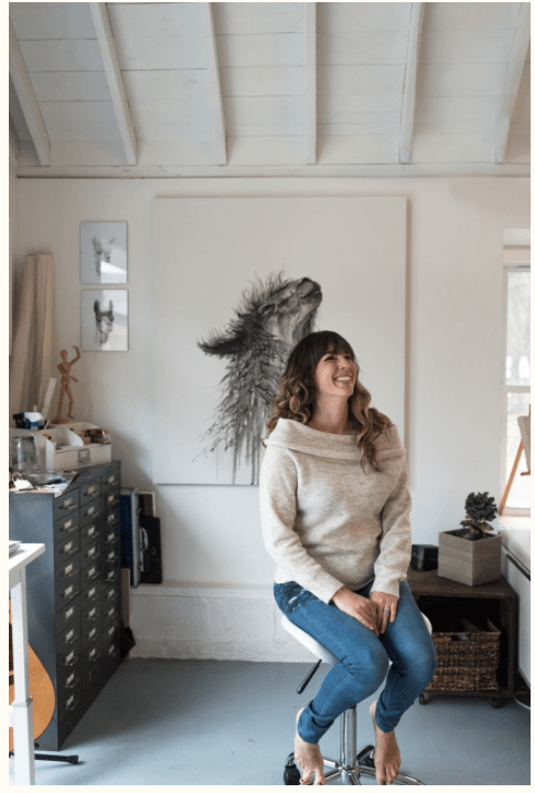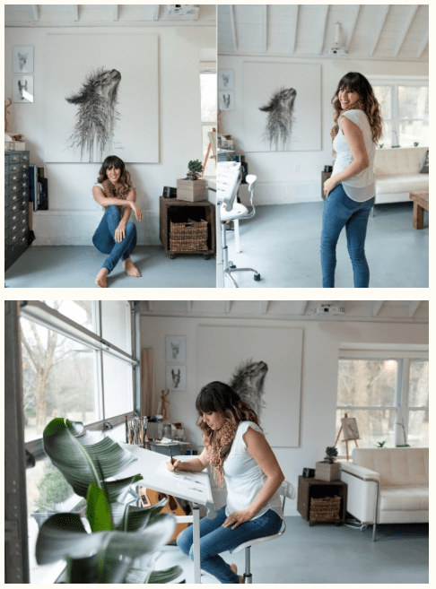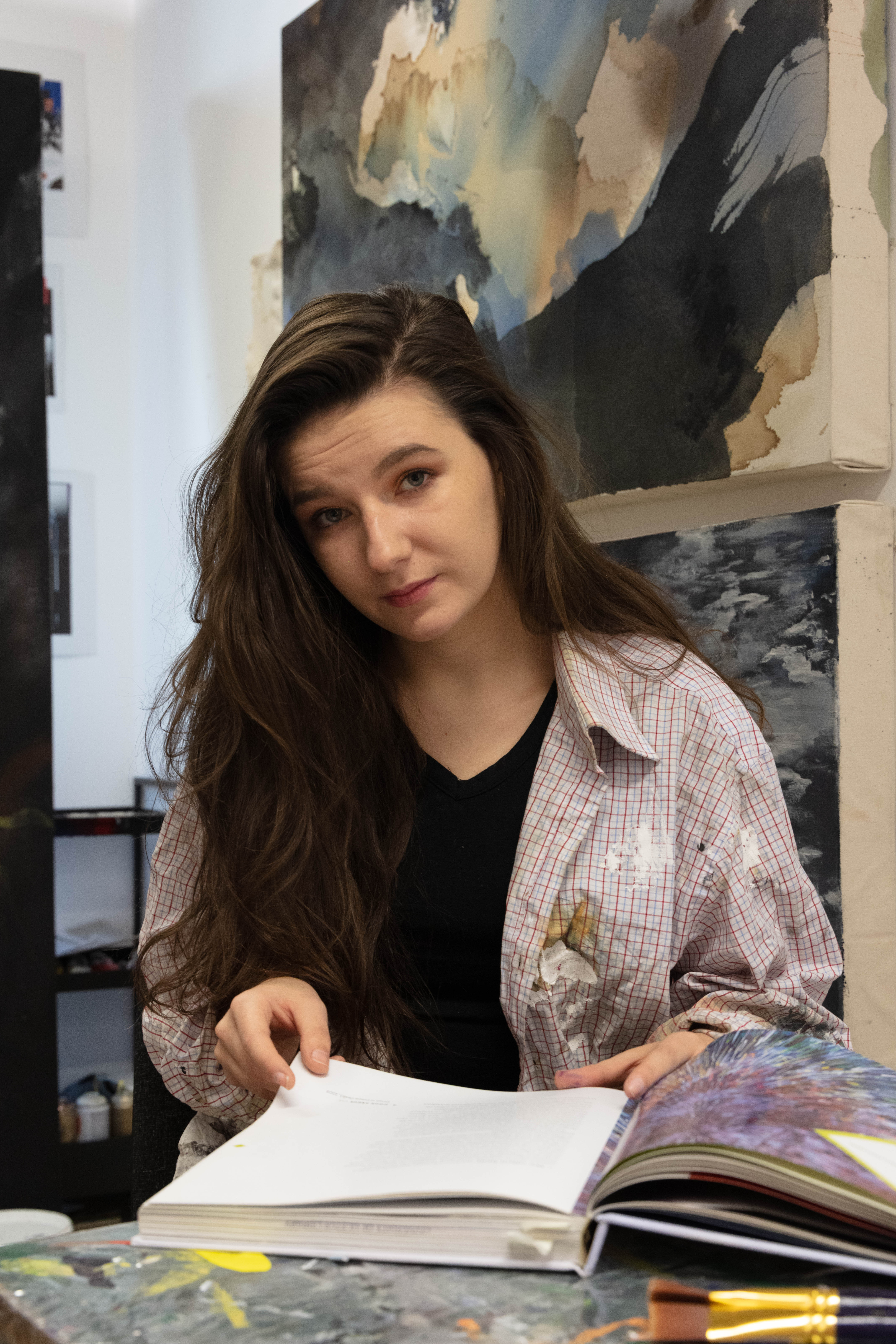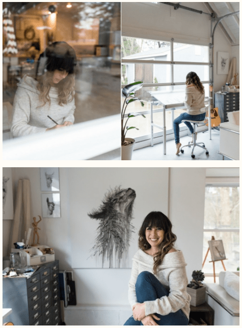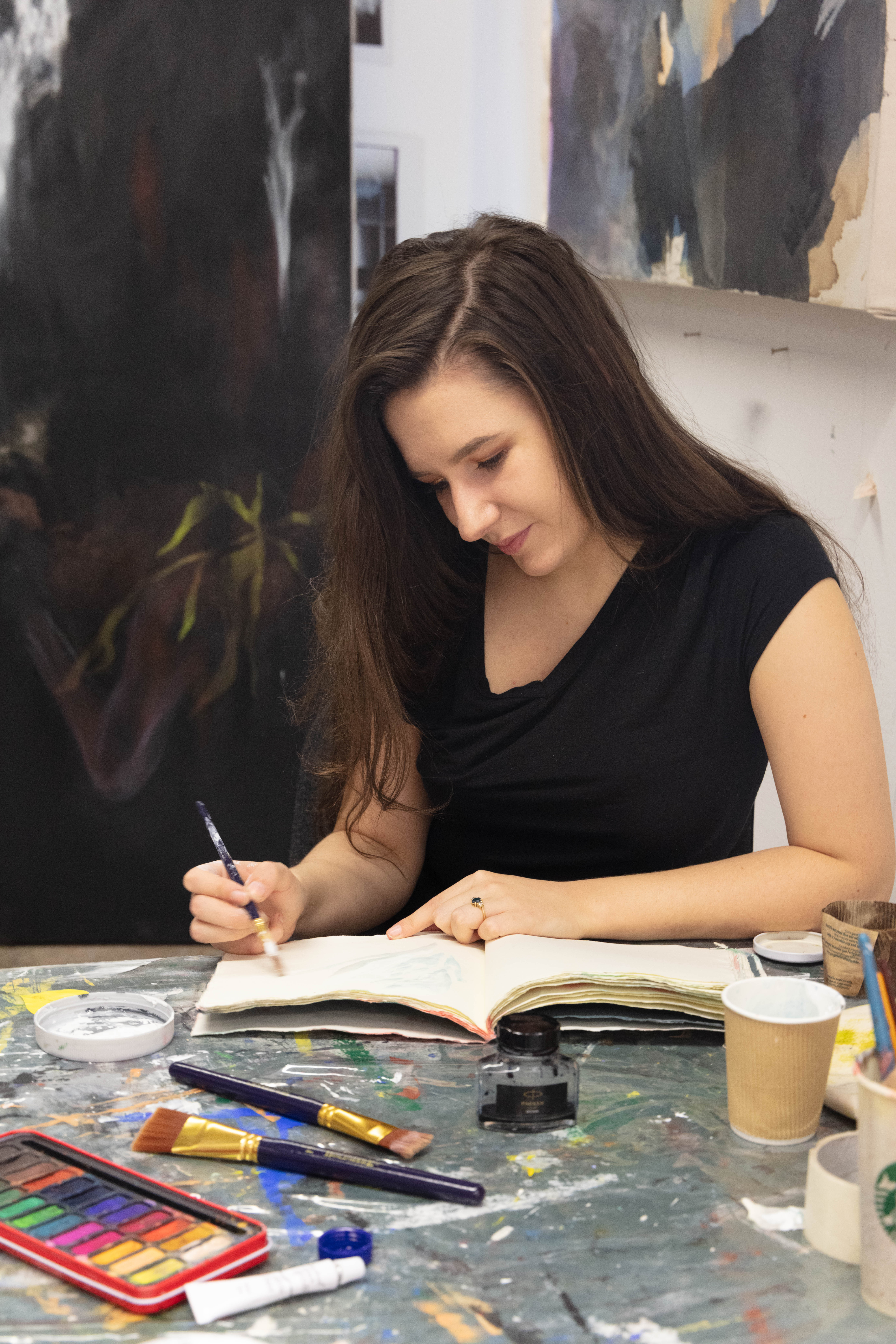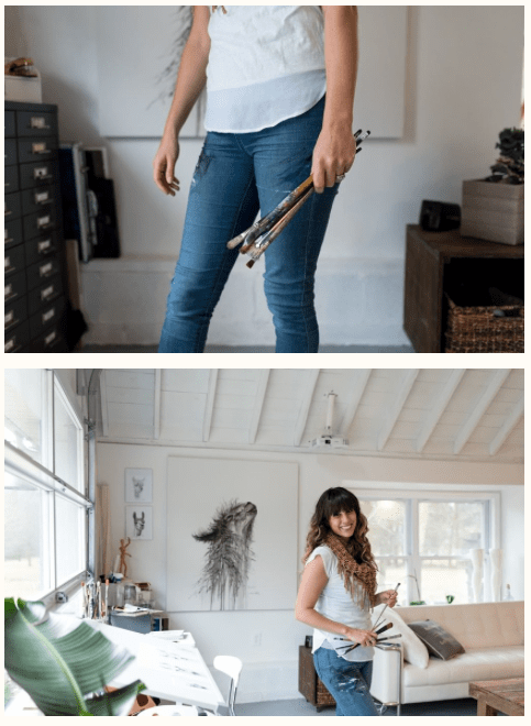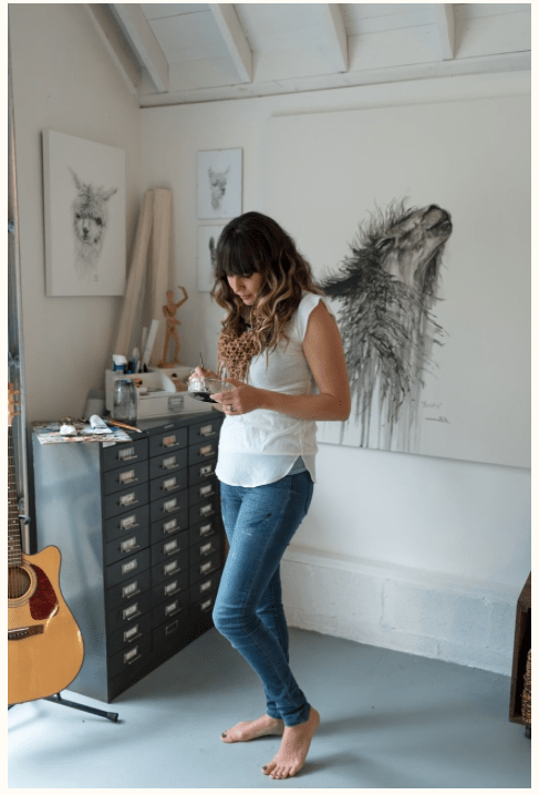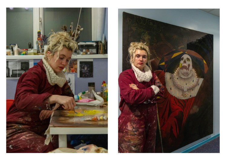 For Amy I decided to pick these two images as I feel that they work really well together. They show her environment – studio place but also the outcome of her work – portrait against the work. I decided to have the two images beside each other as i couldn’t find one image that would’ve spoke that much as those two. One image wouldn’t be a successful way of showing her as fine art artist in my opinion anyway.