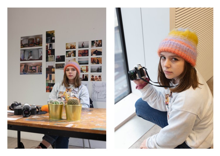 Emily is a fine art student who specializes in the photography, using her creative mind – she takes images of something she sees while walking past something (her way of photographing is different to my way of photographing we both have different styles and approaches to it.) The reason to why i used these two images as i feel that they show her creative profession – her in her studio place with her recent work in the background is very nice way of showing/ telling about her location and the environment she is in. I included a photo of her trying to take an image as I felt that just say more about her. But looking at it now i feel like the one image on its own would work as well i will include it below for comparison.